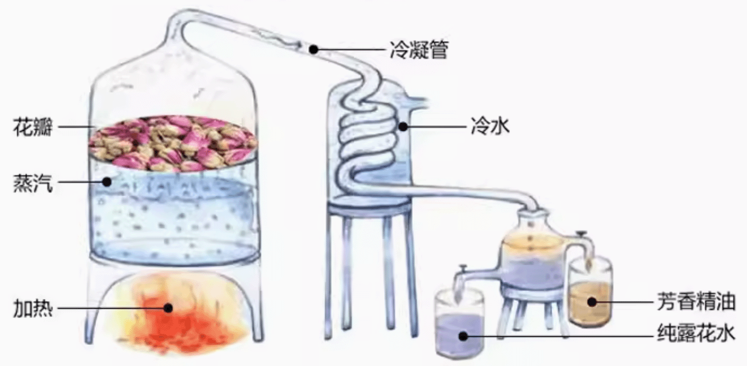 的不銹鋼蒸餾容器(蒸餾器),在容器底部加熱或通入蒸汽。當炙熱的蒸氣充滿在容器里,會將植物內存的芳香精油成分隨著水蒸氣蒸發,并且隨著水蒸氣通過上方
